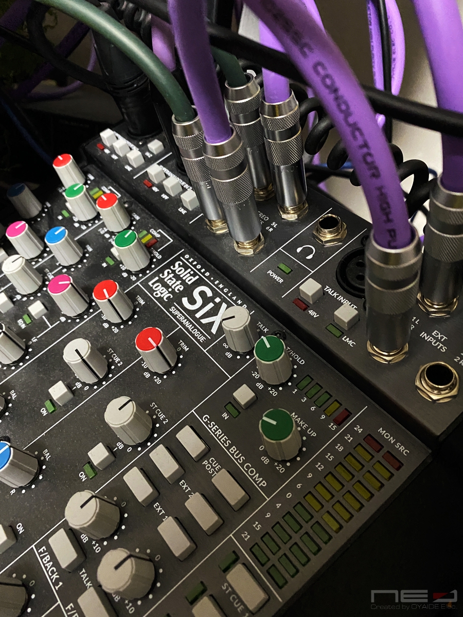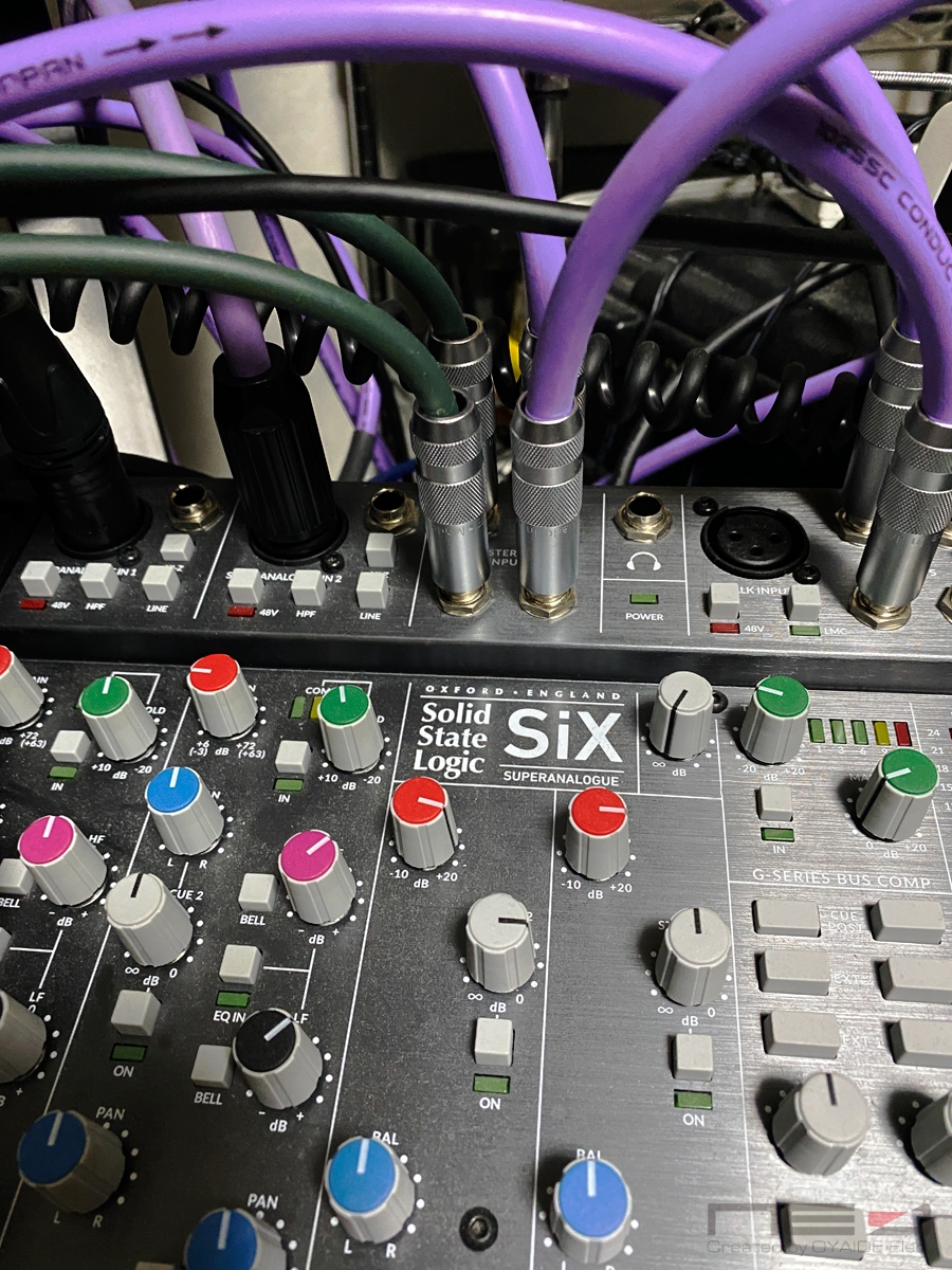 Sixにはマイク、ギター、生ベース、別のアナログミキサーでまとめたハードシンセを送っています。