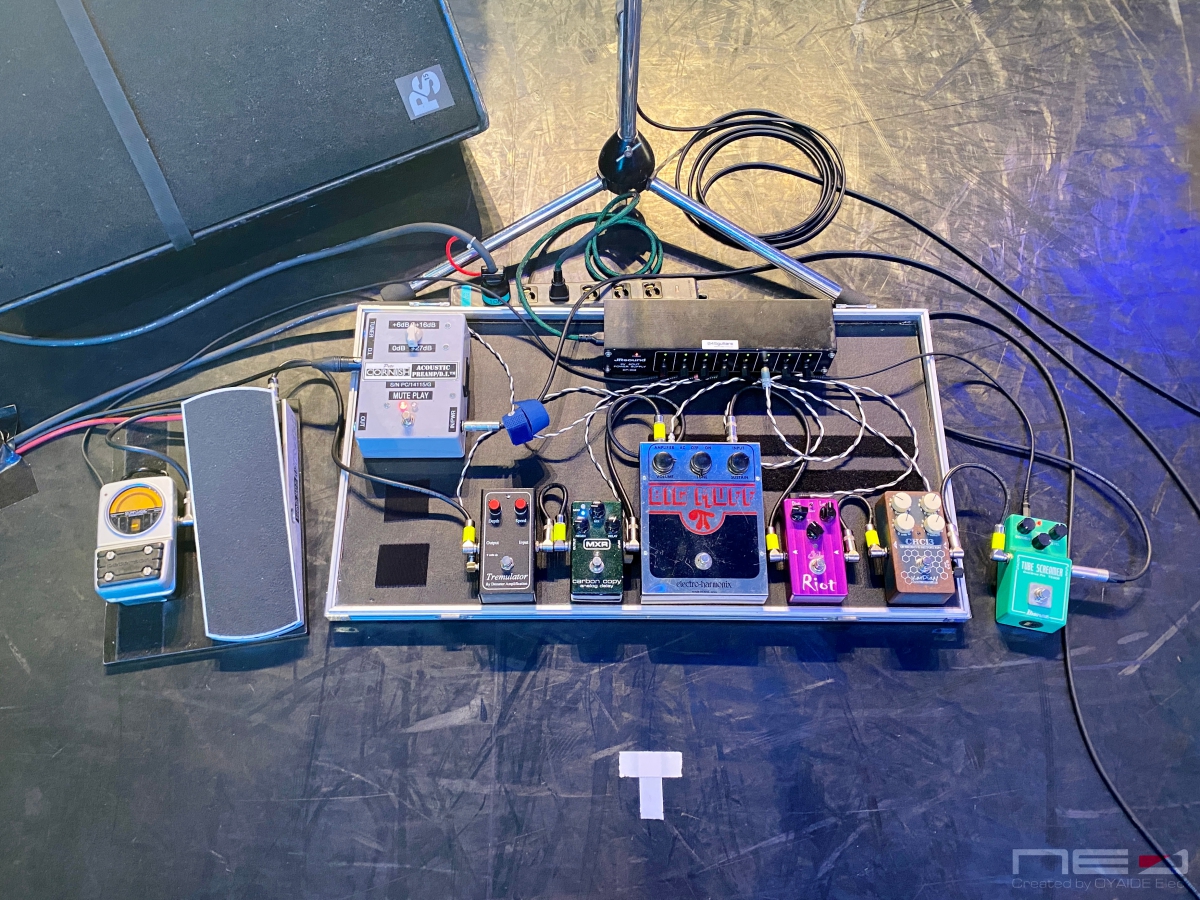 こだわり抜いたギター、エフェクターの素晴らしい音色を、QAC-222Gでマイクで集音しやすいレンジにまとめ、DC-3398で中域をクリアーで押し出しの強いキャラクターに整えるという手法が、辿り着いた答えでした。